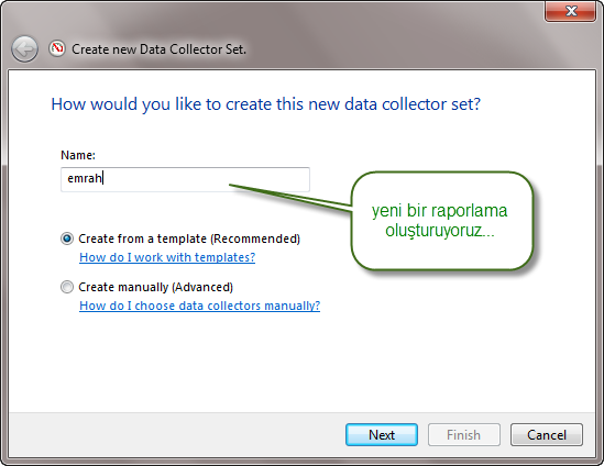 Varsayılan olarak gelen bu öğelerin yanı sıra kullanıcı tarafından tanımlanan Data Collector set öğeleri de oluşturulabilir.